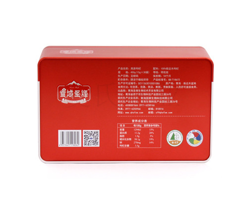 此款青海黑枸杞包裝禮盒,材質(zhì)選用國產(chǎn)0.25mm的鍍錫磨砂鐵,具有良好的防腐性,密封性,抗壓性等特點。此款鐵盒將紅色轉(zhuǎn)為具有活力的喜慶紅,完全可將產(chǎn)品通過這款鐵盒包裝表現(xiàn)出來,起到一種無形的宣傳效果。